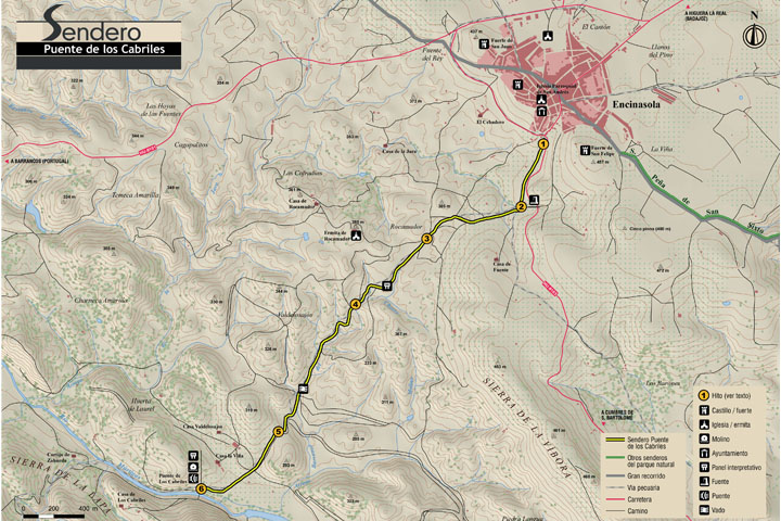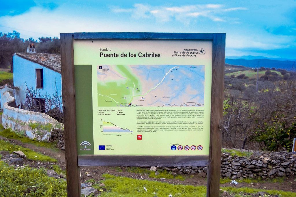 El sendero del Puente de Los Cabriles comienza junto a la carretera que une Encinasola con Cumbres de San Bartolomé y sigue un trazado paralelo a ésta hasta alcanzar el Abrevadero del Pilar de Acá integrado en la Colada del Camino de la Contienda y donde podemos encontrar con señalización descriptiva del papel de la ganadería y de la trashumancia en toda esta comarca trasfronteriza con Portugal.