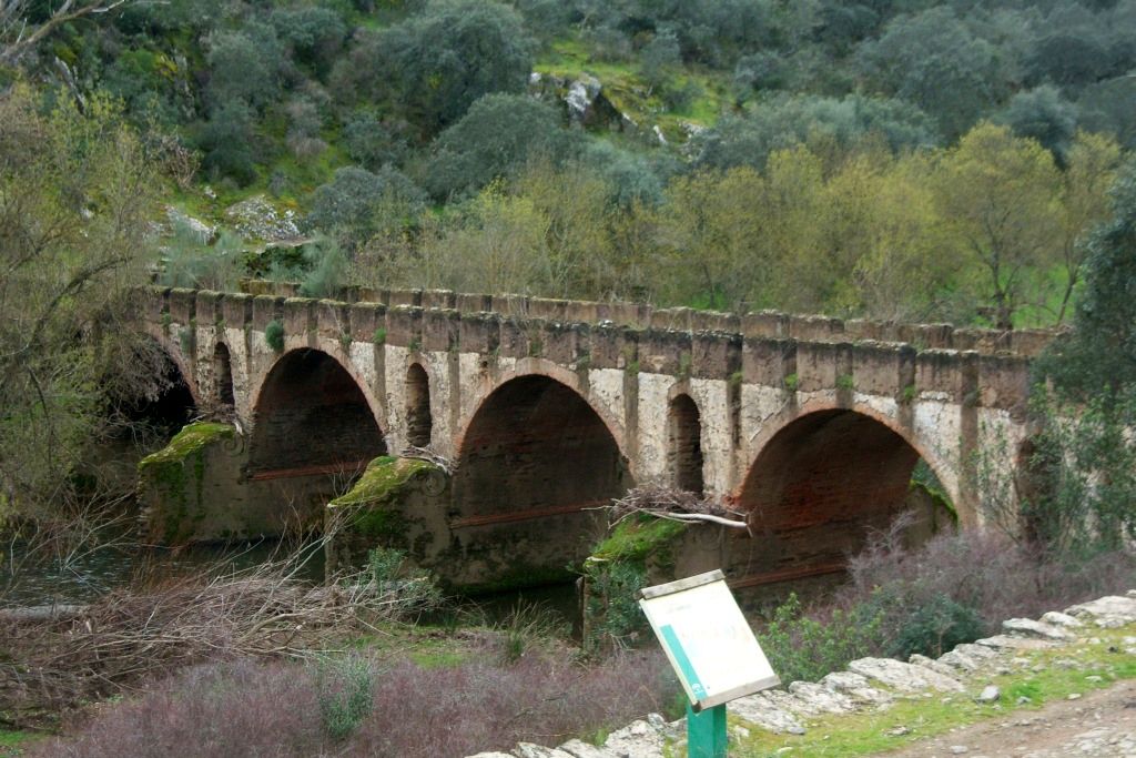 El últimos tramo del descenso coincide con un nuevo cambio en el paisaje que ahora se vuelve menos abrupto y más abierto. Las afloraciones rocosas desaparecen y las panorámicas son ahora mucho más abiertas y amplias. A ambos lados del camino vuelven a extenderse dehesas de encinas, olivares y en las zonas más bajas, cultivos de eucalipto que van acompañándonos hasta alcanzar la rivera del Múrtigas y unos metros más a delante, el Puente de los Cabriles, final de nuestro recorrido. Se trata de una construcción datada en torno al siglo XV que servía en su momento para comunicar la población de Encinasola con la comarca fronteriza de Las Contiendas y que sorprende por sus dimensiones y espectacularidad. El nombre de «los Cabriles» alude a las figuras a modo de cabezas de carnero que decoran la parte alta de los tajamares adosados a sus pilares. Desde aquí, se puede descender hasta la rivera y disfrutar el magnífico bosque en galería que discurre a ambos lados del cauce: fresnos, álamos, chopos y sauces junto con majestuosos ejemplares de eucalipto blanco ofrecen sombra y cobijo a multitud de aves, reptiles y pequeños mamíferos.