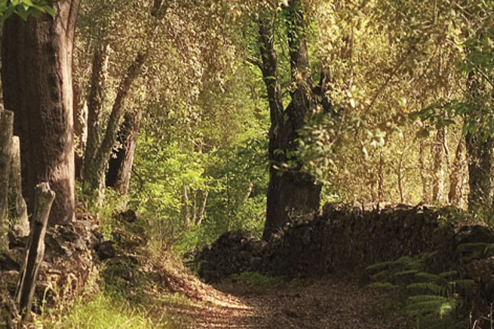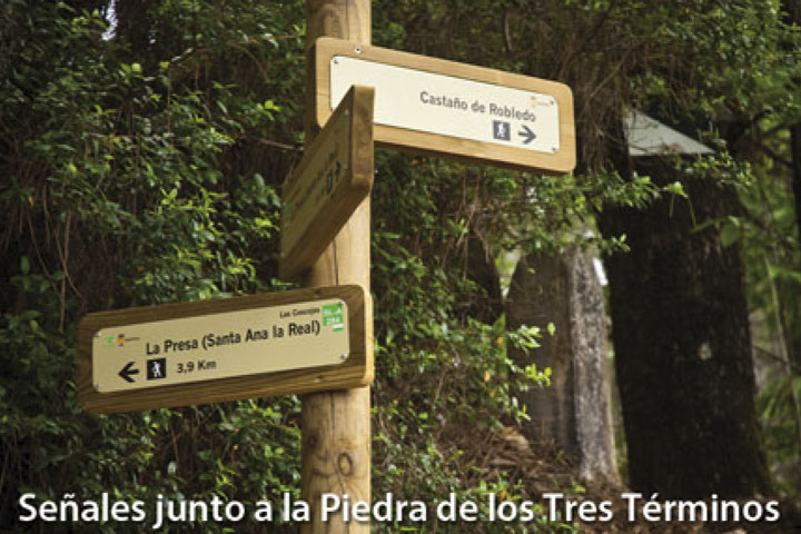 Una vez iniciado nos llevará a un bosque de Castaños, el cual cruzaremos buscando un pequeño sendero entre muros de piedra, sin dejarlo hasta salir, llegamos a la piedra de los 3 términos, donde giraremos a la derecja y bajaremos por el camino Santa Ana la Real – Castaño del Robledo, hasta dejar a nuestra derecha el camino de los Chorros de Joyarnacón y llegar de nuevo al cruce indicado arriba.