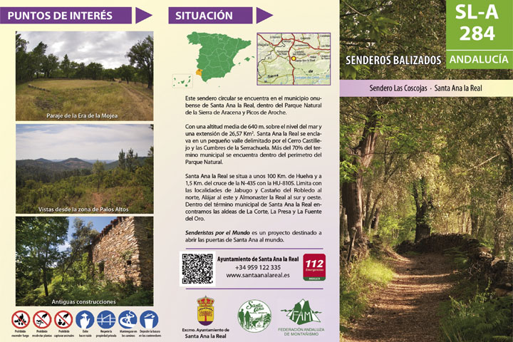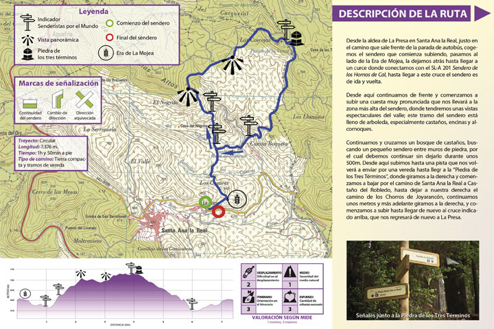 Se trata de un sendero circular, que comienza y termina en La Presa – aldea de Santa Ana la Real, justo en el camino que sale en frente de la Parada de autobús, cogemos un sendero que comienza subendo, dejando a la derecha la «Era de la Mojea», hasta llegar a un cruce (Hasta este cruce el sendero es de ida y vuelta) desde aquí comenzamos a subir una subida muy empinada que nos llevará a una zona llena de Castaños, y veredas entre encinas y alcornoques.